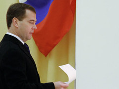 Президент России Дмитрий Медведев и премьер-министр Владимир Путин проголосовали на выборах в Государственную Думу. Медведев голосовал вместе с женой Светланой, тогда как Путин приехал на участок без супруги. И президент, и премьер использовали для голосования электронные урны. |