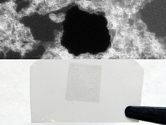 Пора в графене (вверху, белые пятна - загрязнитель) и мембрана на подложке (внизу). Фото Juan-Carlos Idrobo/MIT