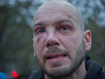 Избитый националистами Игорь Ясин на митинге антифашистов. Фото Евгения Фельдмана с сайта "Новой газеты"